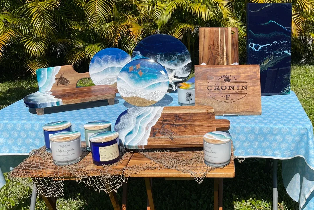 A vibrant mixed-media artist known for her ocean-inspired, colorful art using resin, fluid art, clay, and gold leaf. She captures Florida's natural beauty, focusing on sea life, sunsets, and skies, blending natural elements with sparkling, textured finishes.